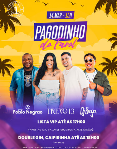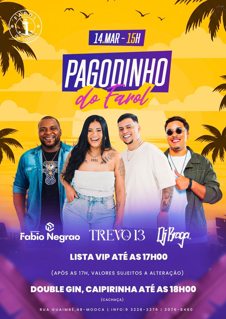 Aos Sabados nós temos duas bandas de pagode e um DJ, temos promoções de Gin e Caipirinha até as 18h. Horario de funcionamento é das 15h até as 00:00